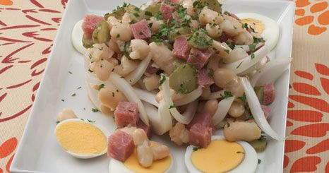 Descasque os ovos e separe as gemas das claras. Triture as gemas e adicione, sem parar de bater, azeite em quantidade suficiente para temperar a salada. Tempere com pouco sal e sumo de limão a gosto pessoal. Bata um pouco mais e incorpore as gemas picadas.