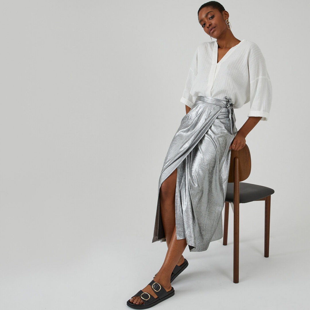 Uma saia multifacetada, que pode ser usada num registo mais formal ou descontraído com ténis ou botas, para uma saída entre amigos. A cor, já por si apelativa, não pede muitos acessórios, apenas os certos.